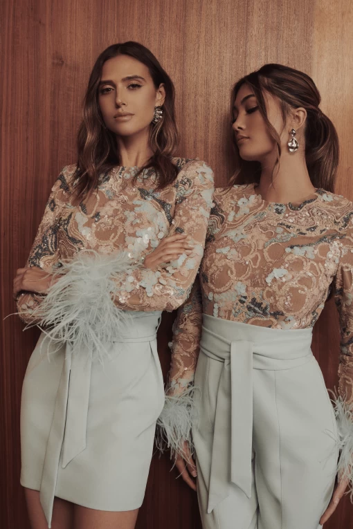 Turn heads and sparkle all night long with the MEDINA Embellished Feather Cuff Mini Dress in a captivating blue! Featuring exquisite embellishments and feathered cuffs, this mini dress brings glamorous flair and unique texture to your special occasions.