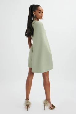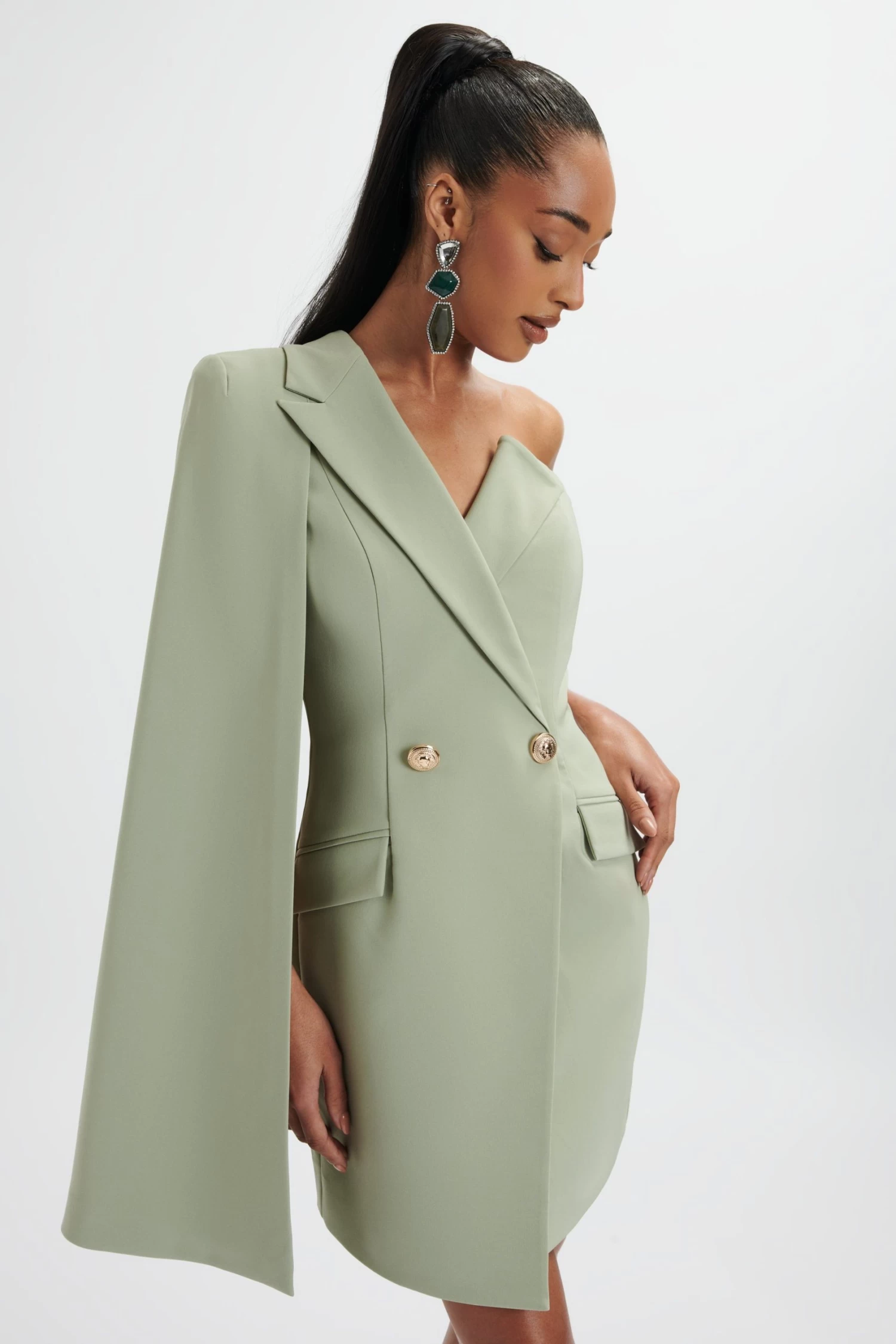 Introducing the perfect combination of style and sophistication with our new season SS24 One Shoulder Cape Blazer Dress in Sage Green. This contemporary tailored piece features an asymmetric one shoulder cape and a tailored wrap over front, finished with luxury gold buttons. Elevate your style with this must-have blazer dress.