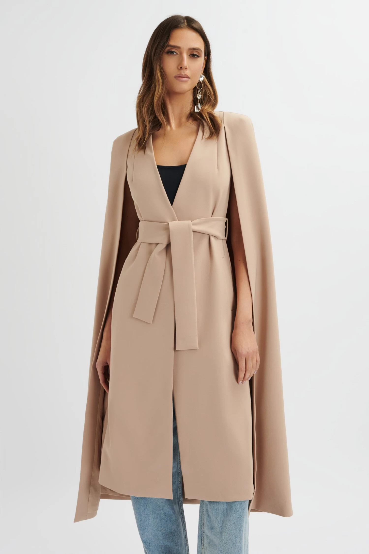 Introducing the ALEXIA in Camel. Crafted with high quality crepe, this longline cape blazer jacket features classic and timeless tailoring. The flattering self-fabric belt cinches the waist, while shoulder pads provide a structured silhouette. With princess seams and bust darts for shaping, this blazer is fully lined, faced, and bagged out for a polished look. Expertly crafted for exceptional style.