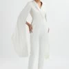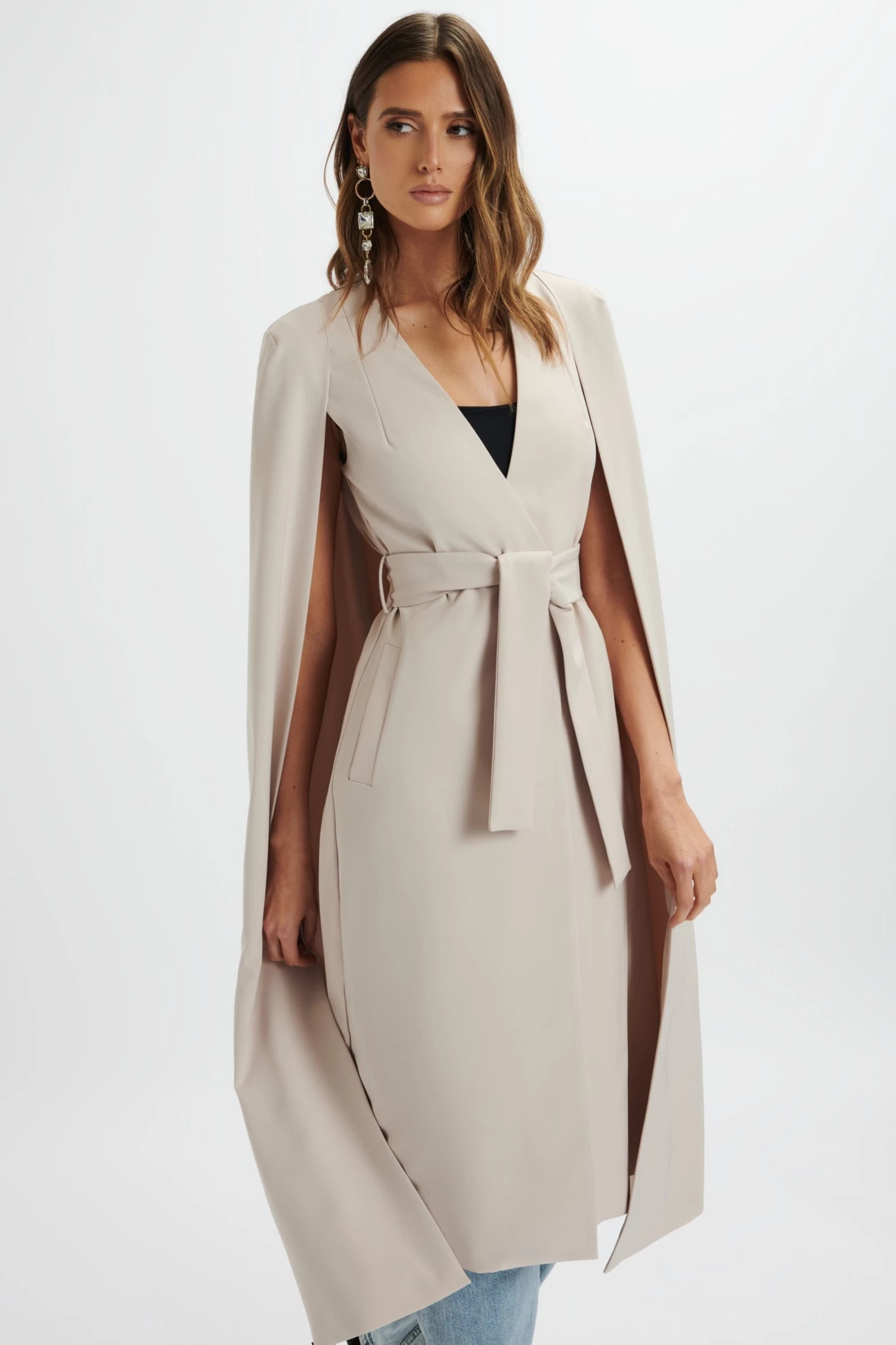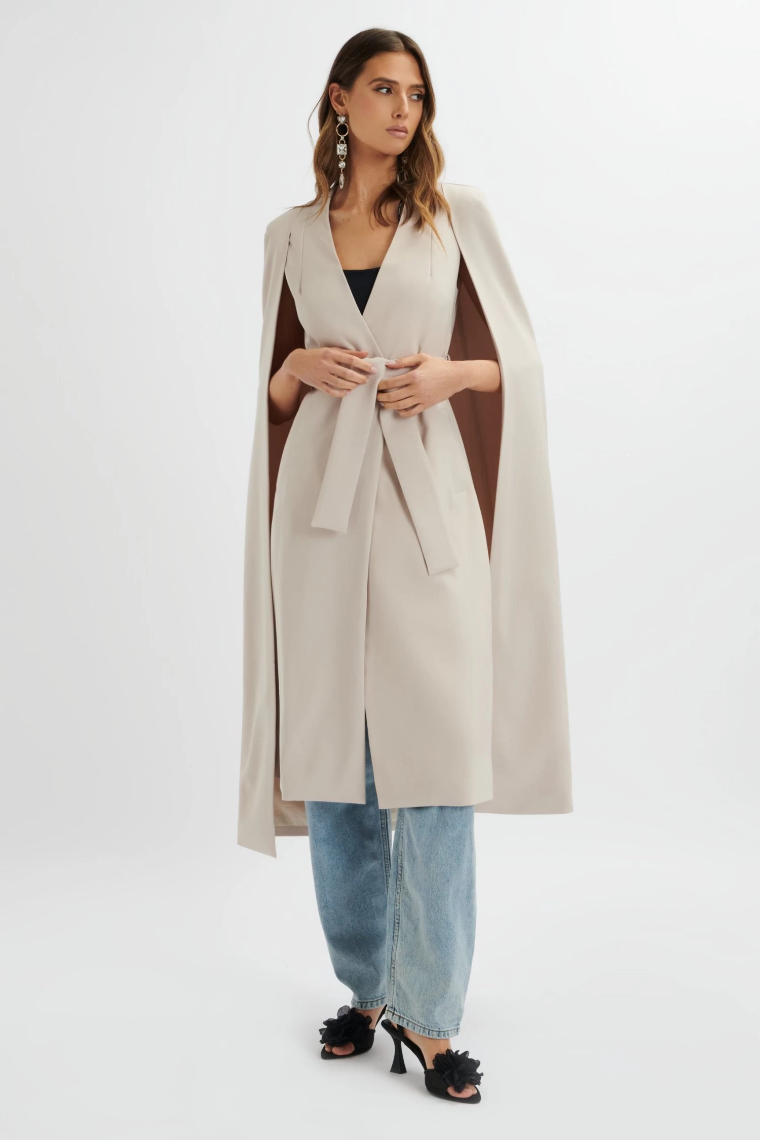 Expertly tailored with high quality crepe, in a neutral stone hue, the ALEXIA is a timeless and versatile piece. With a longline cape design, self-fabric belt for a cinched waist, and structured silhouette with shoulder pads, it flatters the figure. Features include princess seams and bust darts for shaping, as well as being fully lined and faced for a polished look.