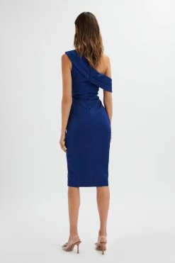 Introducing AUTUMN. This structured midi length dress is crafted from luxurious bonded satin fabric in a beautiful shade of navy. The close-to-body fit is enhanced by bust darts and princess seams, while the asymmetric off shoulder detail and flattering pleats down the body add a touch of elegance. With a thigh split for added allure, this dress is perfect for any special occasion.