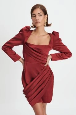 A must have occasion piece, BAILEY. A figure-hugging mini dress with a square neckline & statement puff sleeves to create a look to remember. Crafted in luxurious red satin, pair with gold accessories for the ultimate festive look.