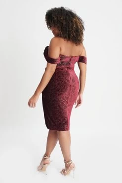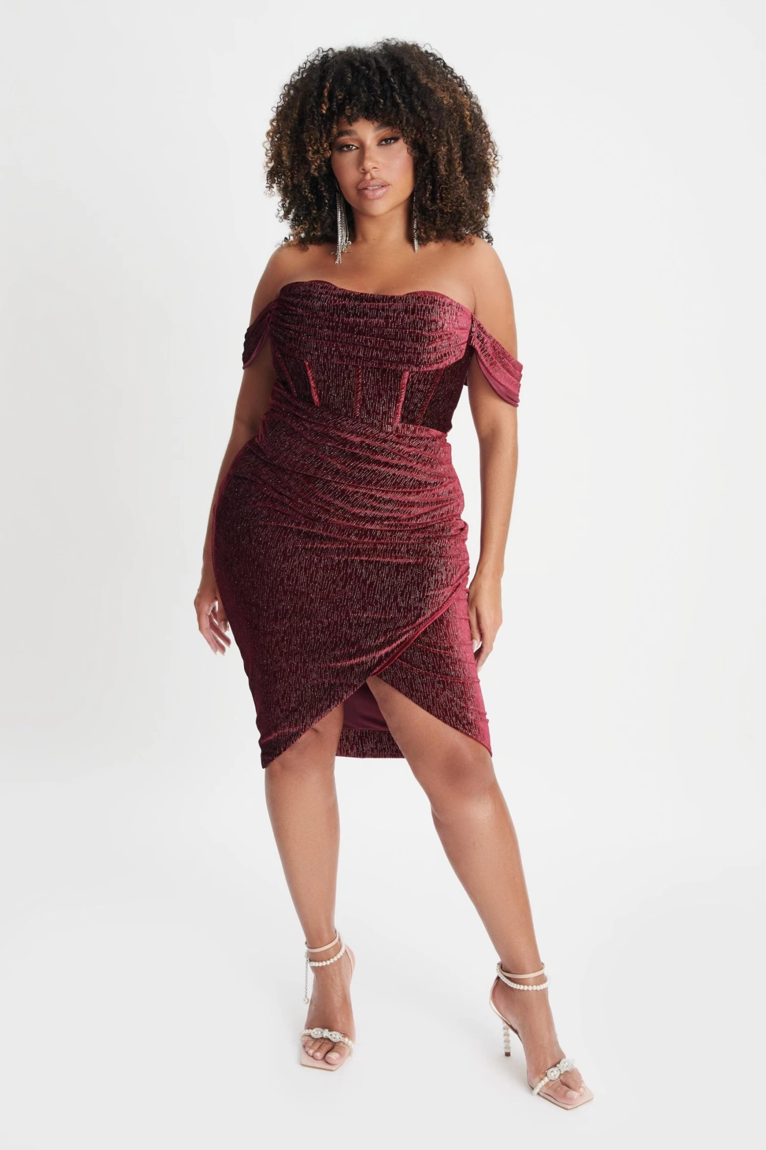 Warning, this dress may cause compliments! Featuring a sultry burgundy velvet body, enhanced by exclusive silver diamantes. Delicately draped, this off the shoulder neckline pairs perfectly with corset detailing to create a dreamy hourglass silhouette. Available in sizes 20 – 26.