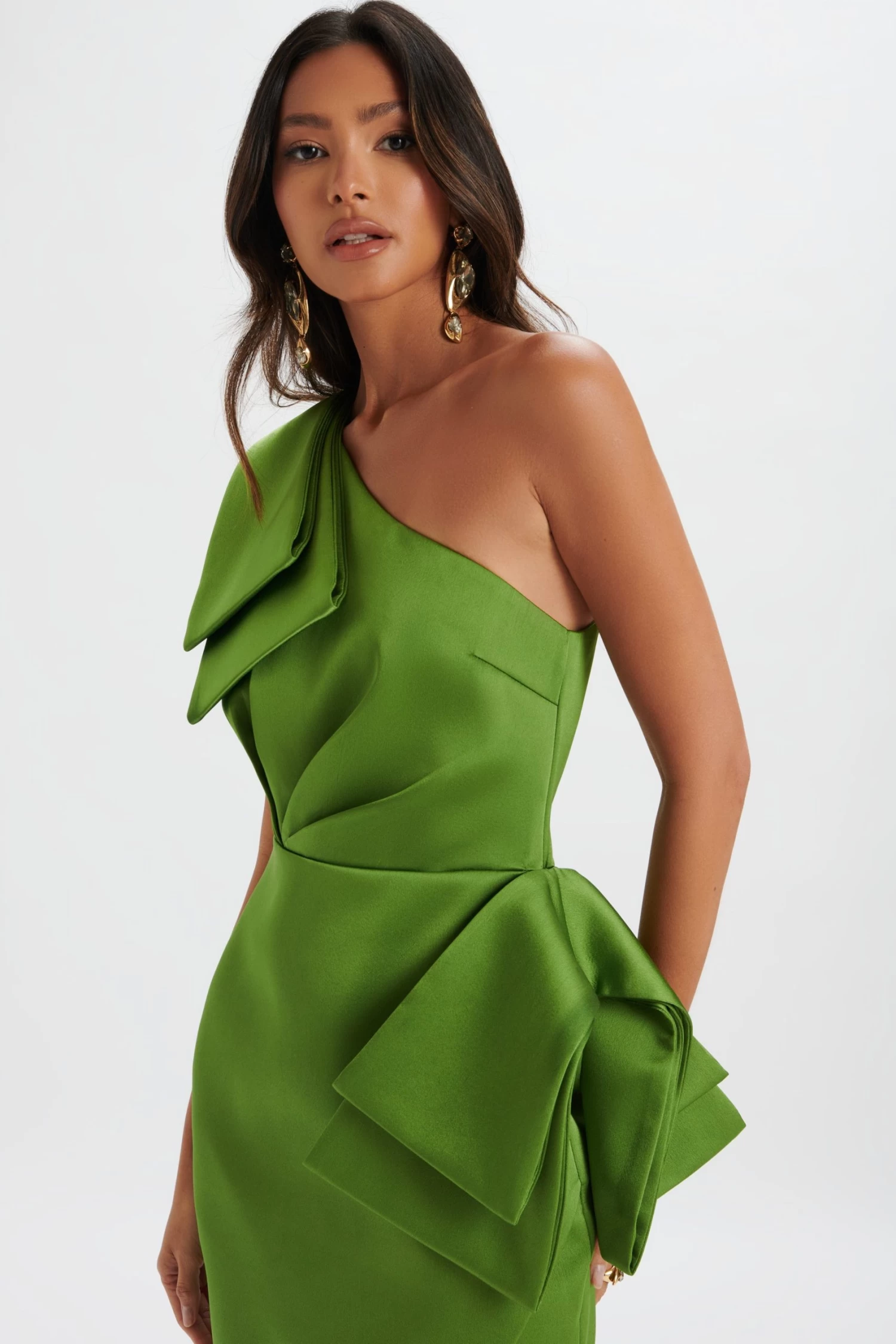 Take your look to the next level with the BLOOM One Shoulder Bow Detail Satin Midi Dress in Green. Expertly crafted with a bold bow detail on shoulder and hip, this green satin midi dress brings a statement to your wardrobe. The one shoulder design and flattering pleating add a touch of elegance to the modern asymmetric silhouette, making it perfect for any occasion.