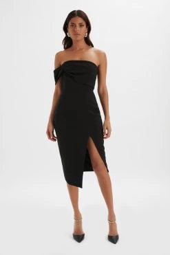 BRIE Bardot Knot Twisted One Shoulder Midi Dress In Black