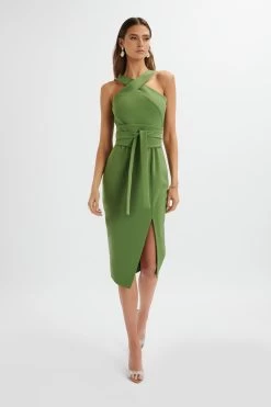 The BRIELLE is crafted from premium crepe fabric in a regal green shade. Its midi length and close-to-body fit are designed to flatter your figure, whilst bust and waist darts add extra shaping. The cross neck halter style and self fabric obi belt provide a glamorous touch.