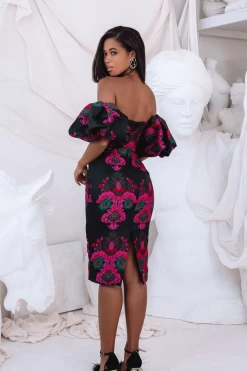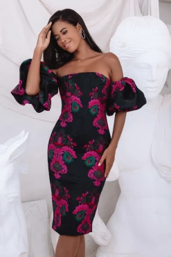 This CAPRI Jacquard Volume Sleeve Bardot Midi Dress in Black is the perfect style for any evening occasion. Featuring a luxurious jacquard fabric, puff sleeve detailing and a bardot neckline, this dress is both stylish and sophisticated. Elevate your look with ease with this beautiful statement piece.