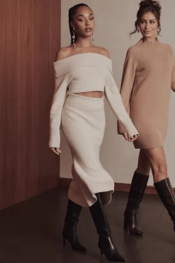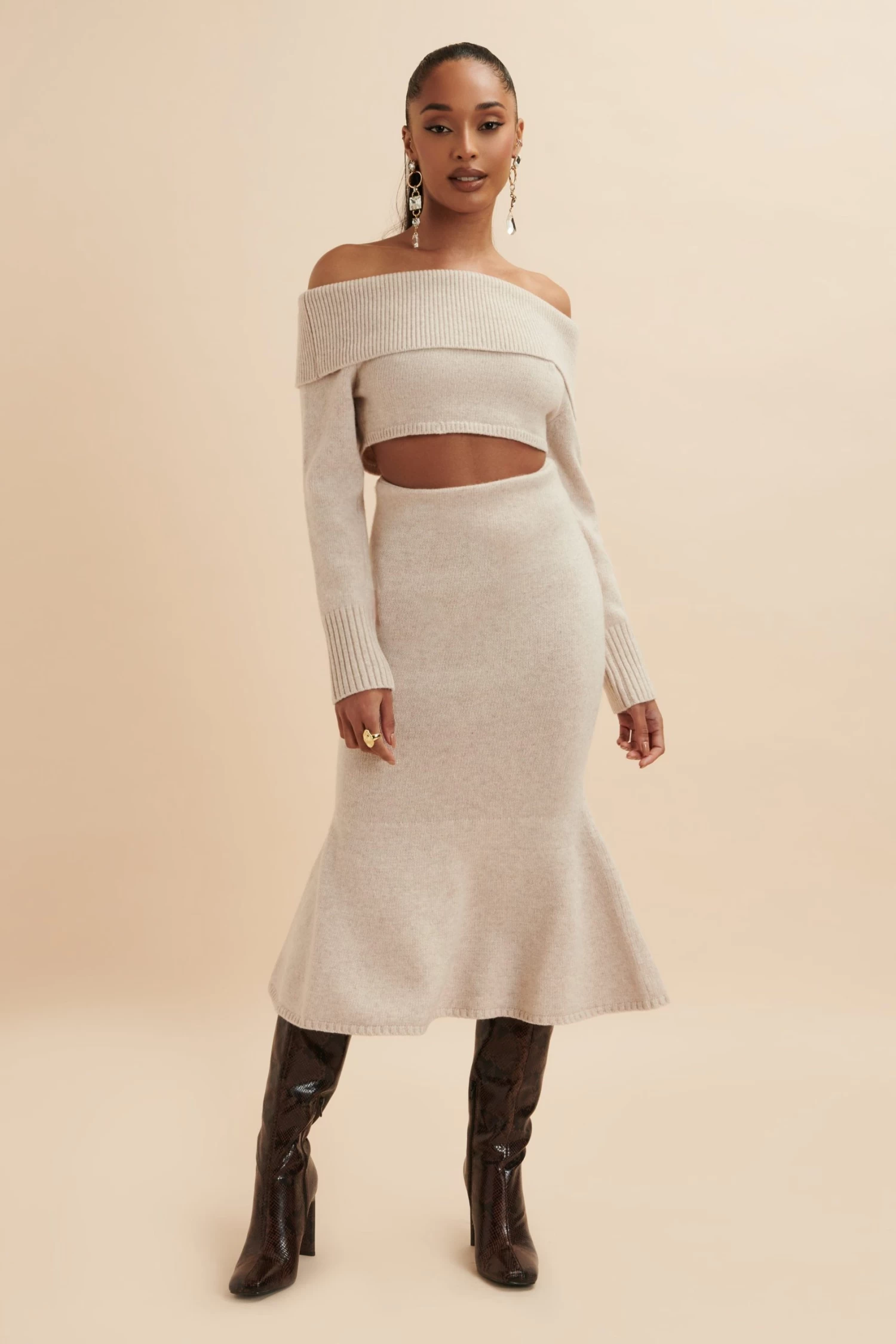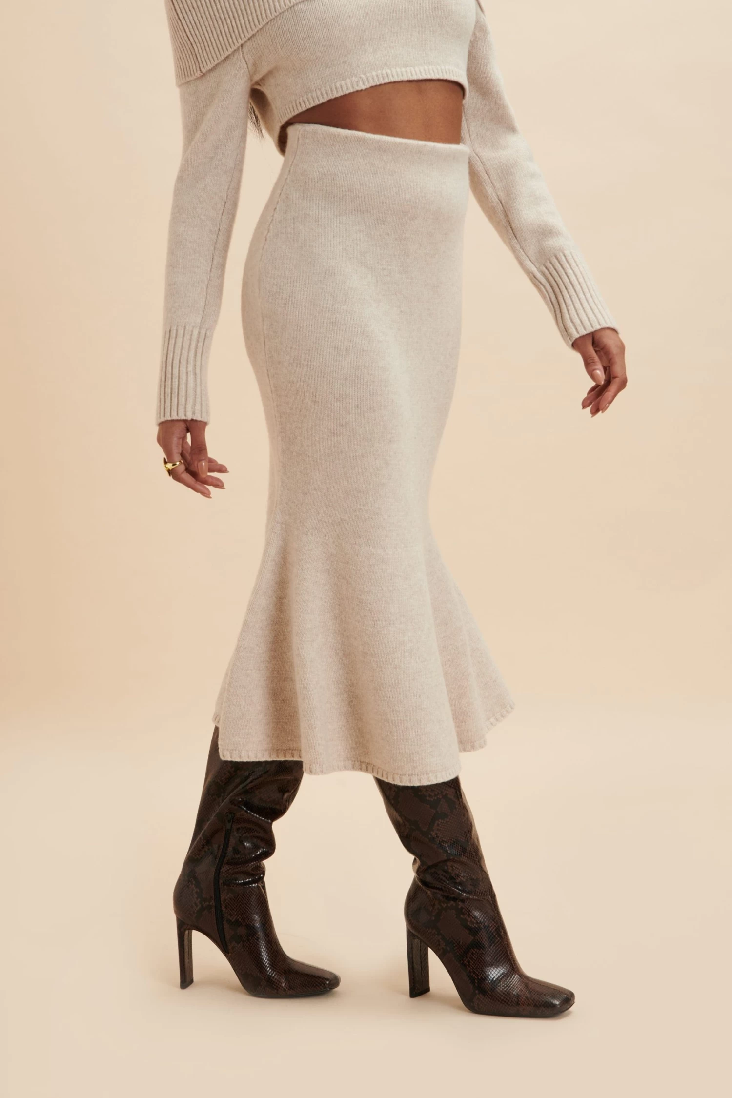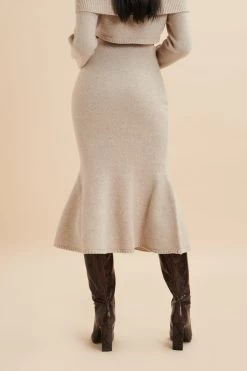 Update your winter wardrobe with our ELENI midi skirt. Made with a luxurious wool blend enhanced with cashmere, this skirt is both soft and warm. The knitted construction adds texture, while the fit-and-flare fishtail hem creates a flattering silhouette. Perfect for any occasion, this midi length skirt will keep you looking stylish and feeling comfortable.