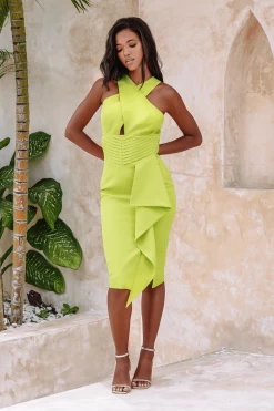 GWENDOLYN Cross Neck Pleat Waist Midi Dress In Chartreuse
