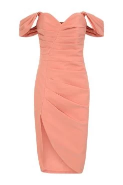 Our best-selling HAILEY bardot midi dress is back in spring ready coral. The bardot neckline, cinched waist and delicate pleating detail create a feminine, sexy silhouette.
