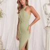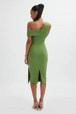 Crafted from premium crepe in a stunning shade of green, HANNAH is the epitome of elegance. With a close to the body fit and bust and waist darts for extra shaping, this dress is designed to flatter your figure. The pleated armband and self fabric drape on the skirt add unique touches to this sophisticated midi dress.