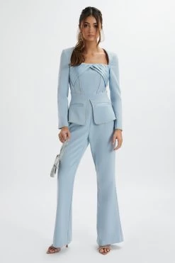 Effortlessly elevate your wardrobe with our JESSIE jumpsuit. Crafted with high quality crepe in a stunning pastel blue hue, this long sleeve jumpsuit features classic blazer tailoring and an elegant square neckline. The contrast bonded satin pleated bust, silver diamante trim, and flattering peplum waist add luxurious detail. With pin tuck on the trouser for an elongated silhouette and close-to-body fit for a premium look, this jumpsuit is a must-have for any formal Occasion.Â
