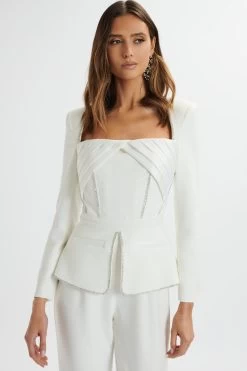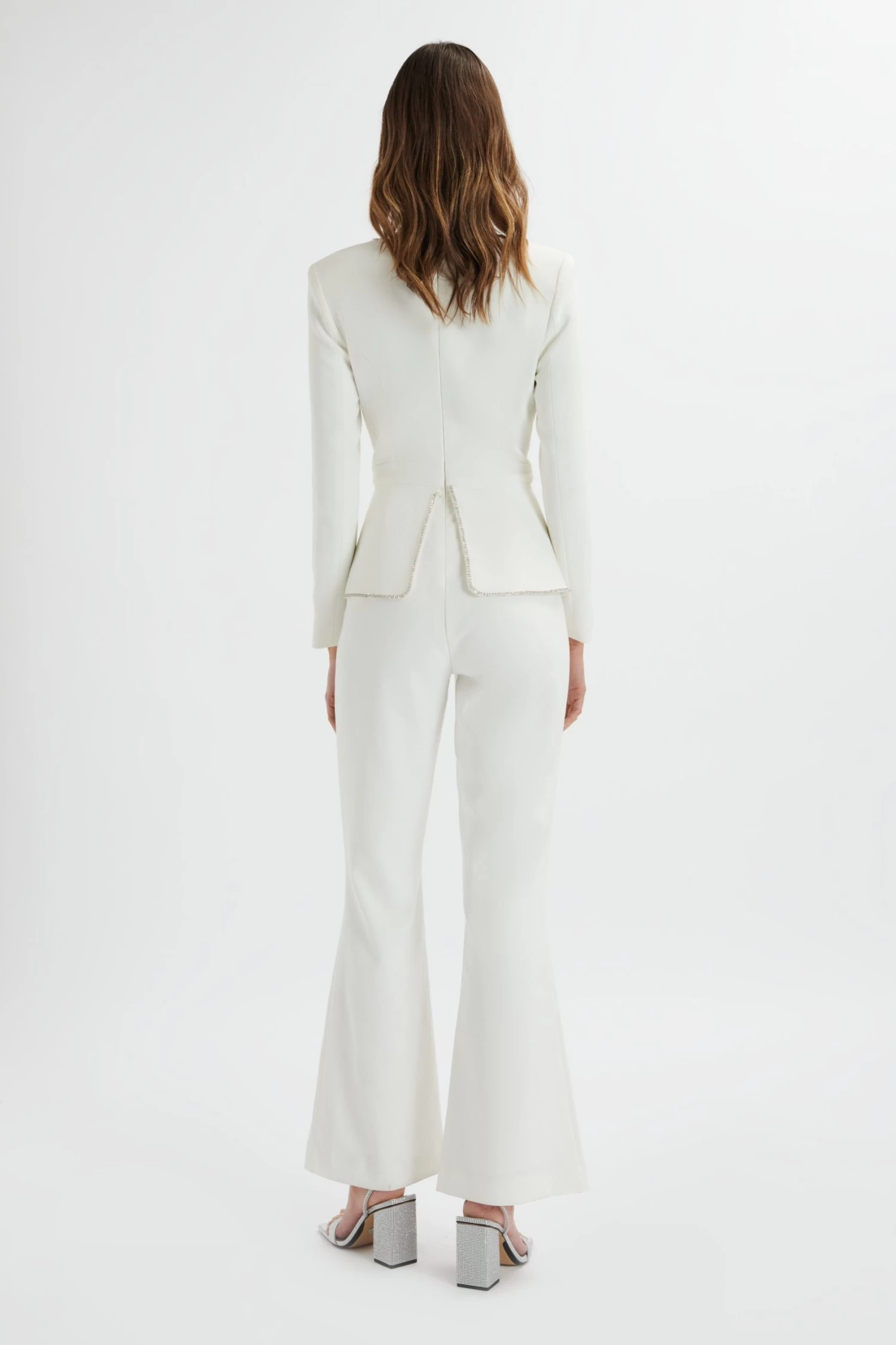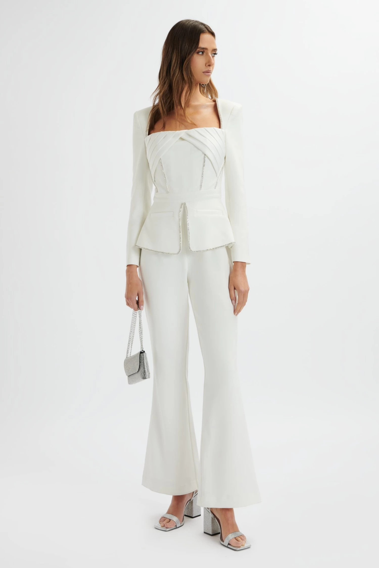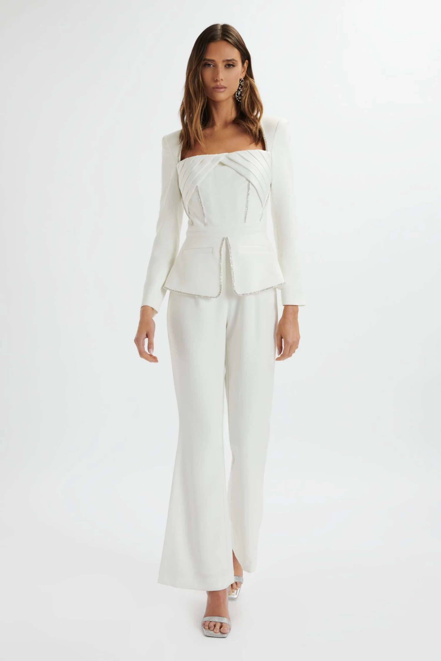 Expertly crafted with high-quality crepe in white, our JESSIE Jumpsuit lives up to its name with classic tailoring and elegant details. The contrast bonded satin pleated bust, silver diamante trim, and flattering peplum waist create a premium silhouette, while the fit-and-flare tailored trouser and pin tuck detail add elongated contour and shaping. A must-have for any formal occasion.