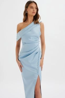Elevate your resort style with this one shoulder maxi dress. The aysmmetric neckline combined with delicate pleats presents a lavish look with delicate tones of dusty blue. Your bridal party will be feeling picture perfect throughout the day.