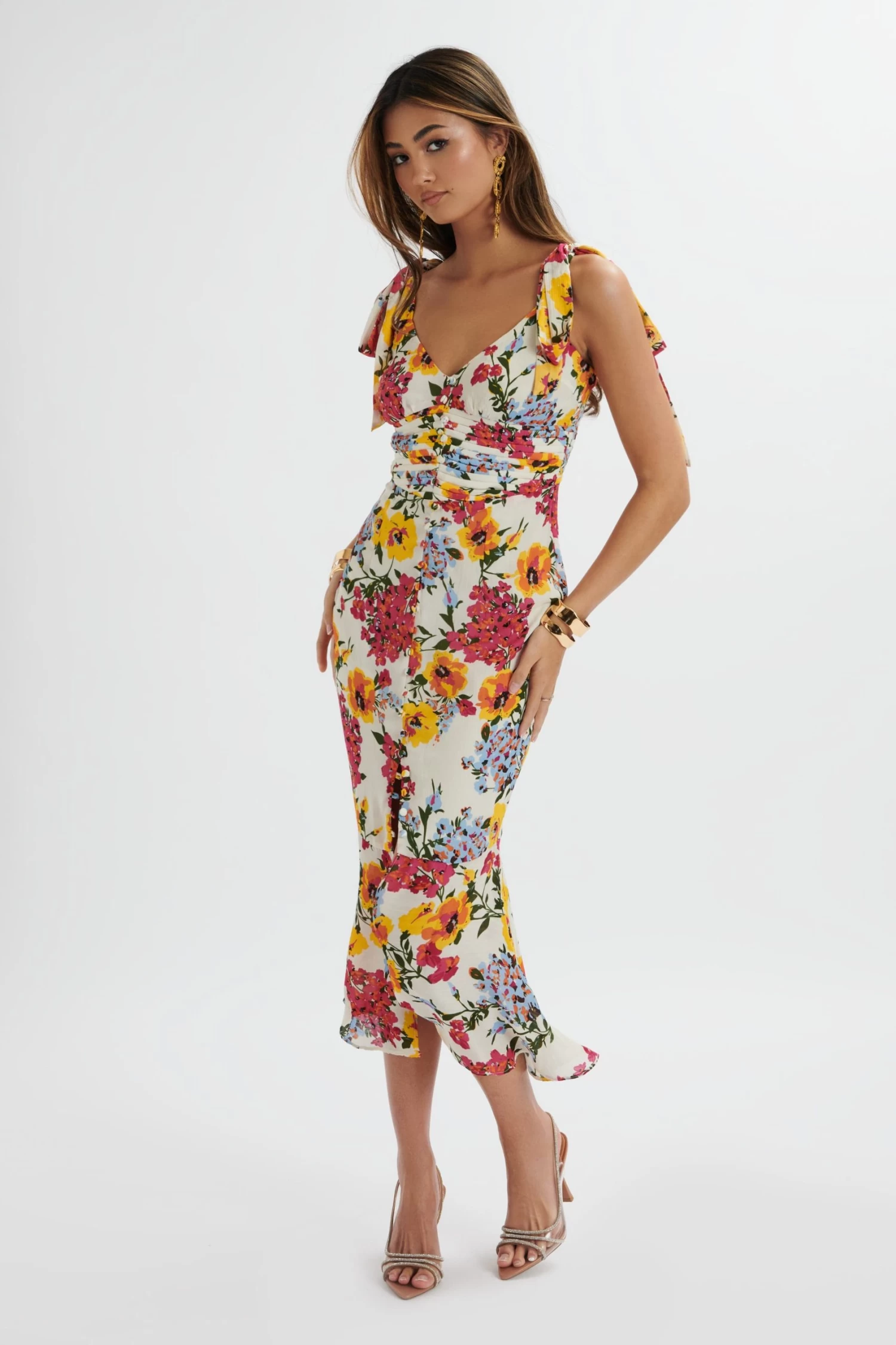 Expertly crafted from premium soft satin with a delicate white floral print, the KAMILA exudes a sophisticated charm. The fit and flare hemline, close to body fit, and bust and waist darts provide a flattering silhouette, while the self-fabric functional tie straps and pleated waistband add a touch of elegance. Perfect for any occasion.