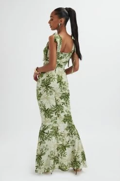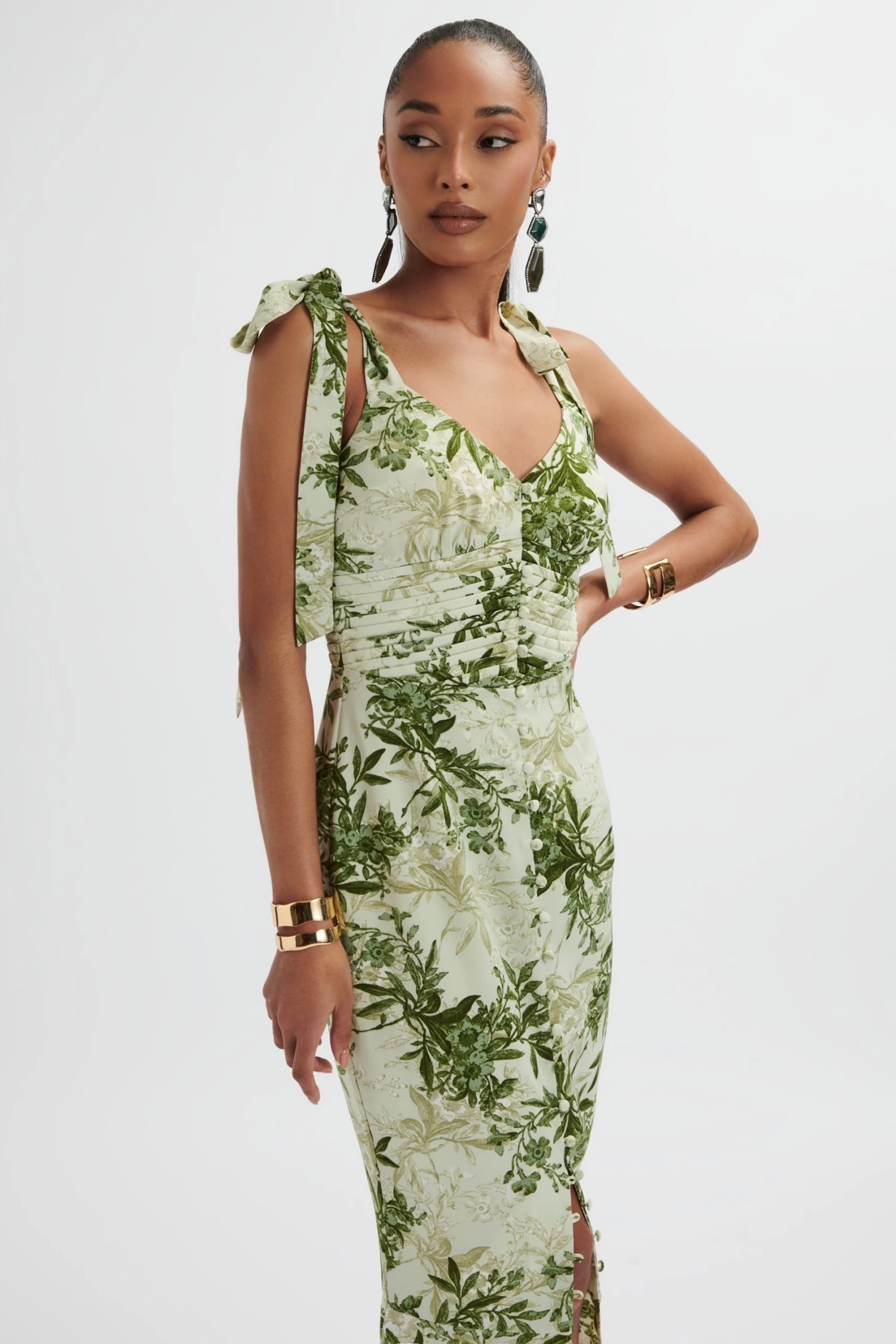 Expertly crafted from premium crepe with a delicate botanical print, the KAMILA maxi dress offers a flattering close-to-body fit and a fit-and-flare fishtail hemline. The pleated waistband, functional tie straps, and waist darts provide extra shaping, while the micro button detailing adds a touch of sophistication. Elevate your wardrobe with this stunning piece.