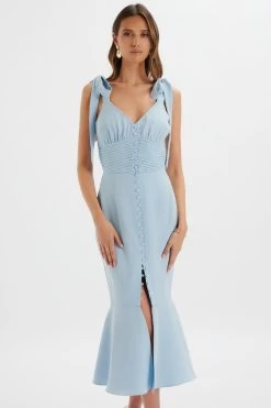 Leave them mesmerised in this delicate and romantic piece, dainty buttons meet in the centre of your figure to skim each curve effortlessly. Statement bows fall on each shoulder in paisley blue to create the must have piece for any upcoming occasion. Wear your hair in a soft up-do and let KAMILA do the talking.