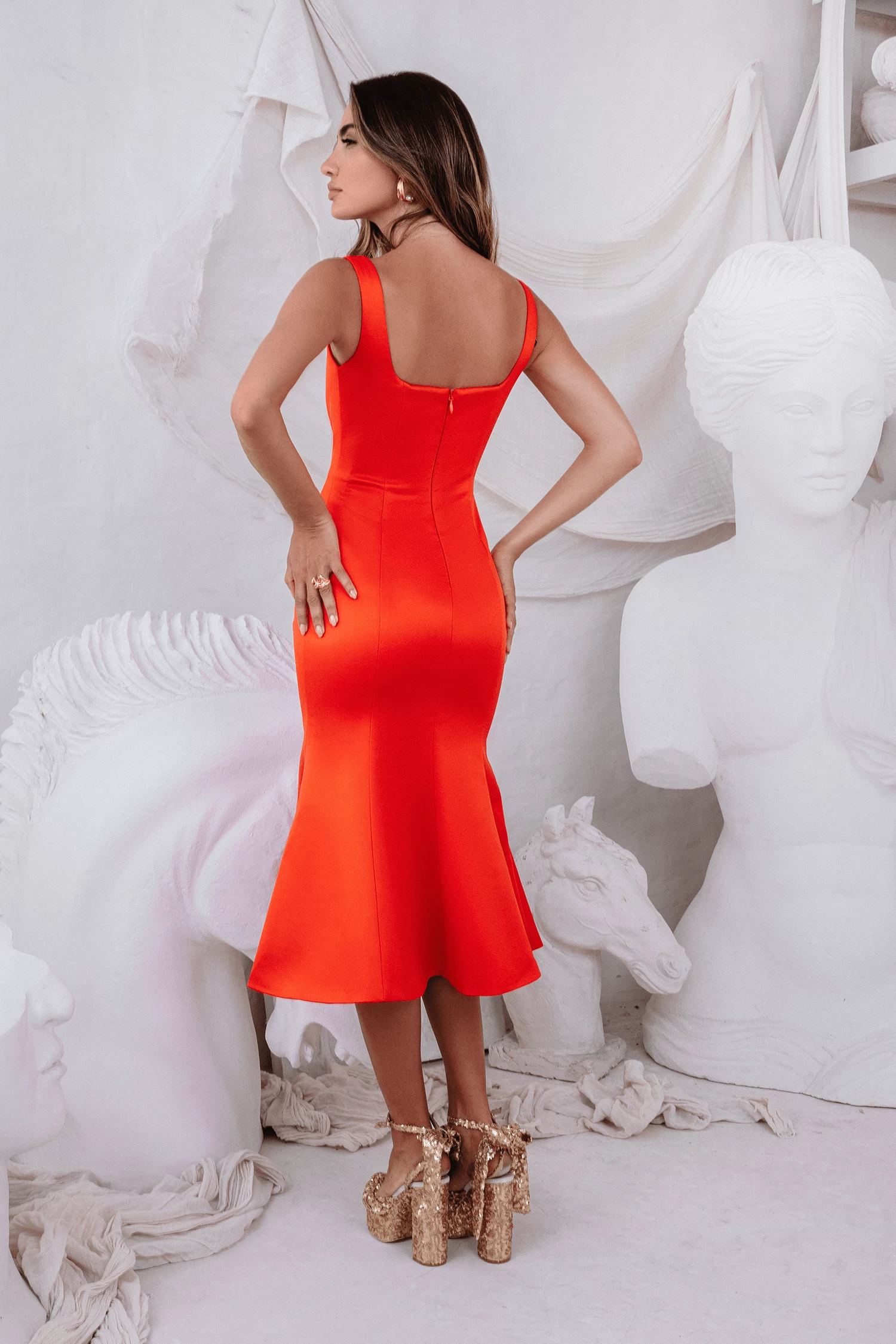 Simply unique, LAINEY is trending in pretty coral red for Summer ’23, making it perfect for special occasions like summer weddings and complimenting your tan on balmy getaways. It’s silk-satin finish pairs elegantly with a cowl neckline and the midi length reveals the perfect amount of skin