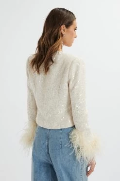 Expertly crafted with a luxury sequin boucle fabric, the LARIA jacket is adorned with embellished diamante buttons and features luxurious ostrich feather cuffs. The collarless, cropped design adds a modern touch to this glamorous piece. Step out in style and make a statement with this elegant beige jacket.