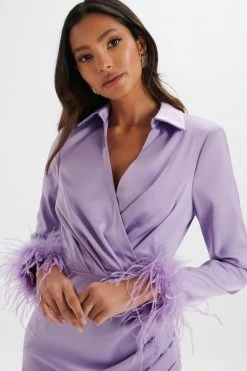 LAURA Satin Mini Shirt Dress With Feather Cuffs In Lavender
