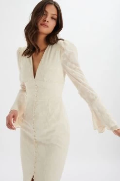 Experience effortless elegance in our LAUREN Fluted Sleeve Maxi Dress. Made from premium floral textured chiffon in a cream hue, this dress features fluted sleeves and a fishtail hem for an elongated contour, while the micro button detailing down the centre front adds a touch of sophistication. This dress is perfect for any spring or summer event, especially when paired with a tan.