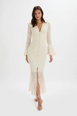 Experience effortless elegance in our LAUREN Fluted Sleeve Maxi Dress. Made from premium floral textured chiffon in a cream hue, this dress features fluted sleeves and a fishtail hem for an elongated contour, while the micro button detailing down the centre front adds a touch of sophistication. This dress is perfect for any spring or summer event, especially when paired with a tan.