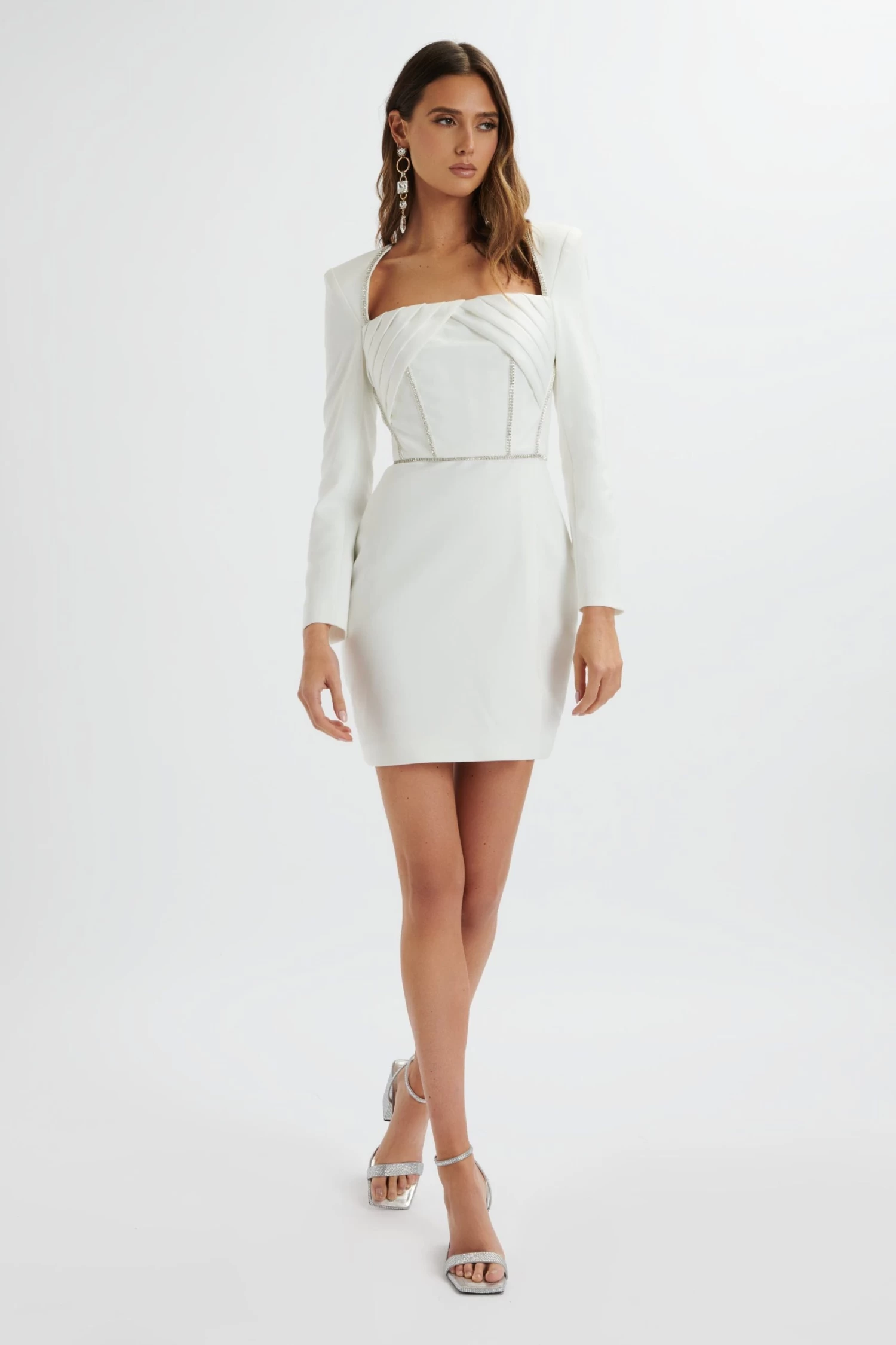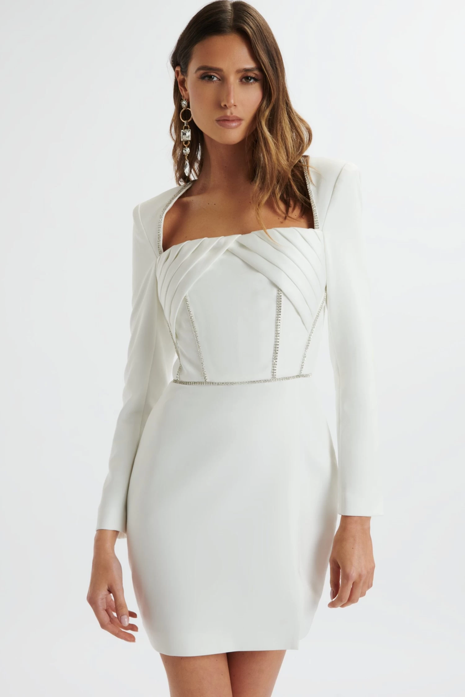 Expertly tailored in high quality crepe, our LIBERTYÂ white blazer mini dress features elegant square neckline and flattering peplum waist, enhanced by silver diamante trim and contrast satin pleated bust. Expertly finished with concealed shoulder pads and darts for a premium silhouette.