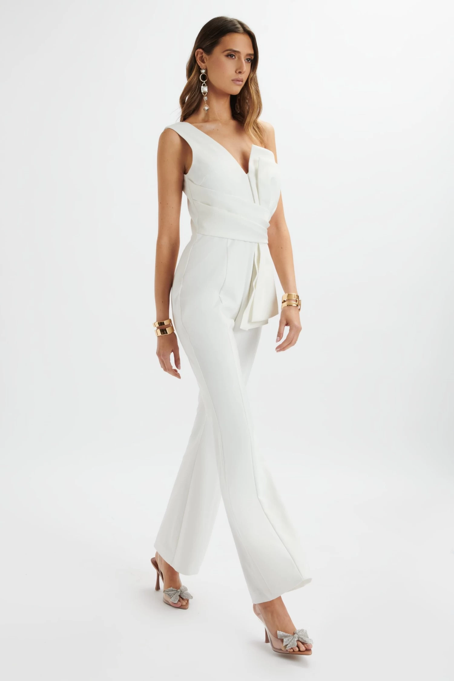 Introducing the LUISA Jumpsuit, crafted with high-quality white crepe for a comfortable and stylish fit. The unique sculptural oversized bow, made with contrasting bonded satin, adds a touch of elegance. The wrap detail cinches and accentuates the waist, while the asymmetric one-shoulder neckline and fit-and-flare design create a flattering silhouette. With a centre front princess seam for elongated legs, this jumpsuit is perfect for all occasions.