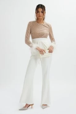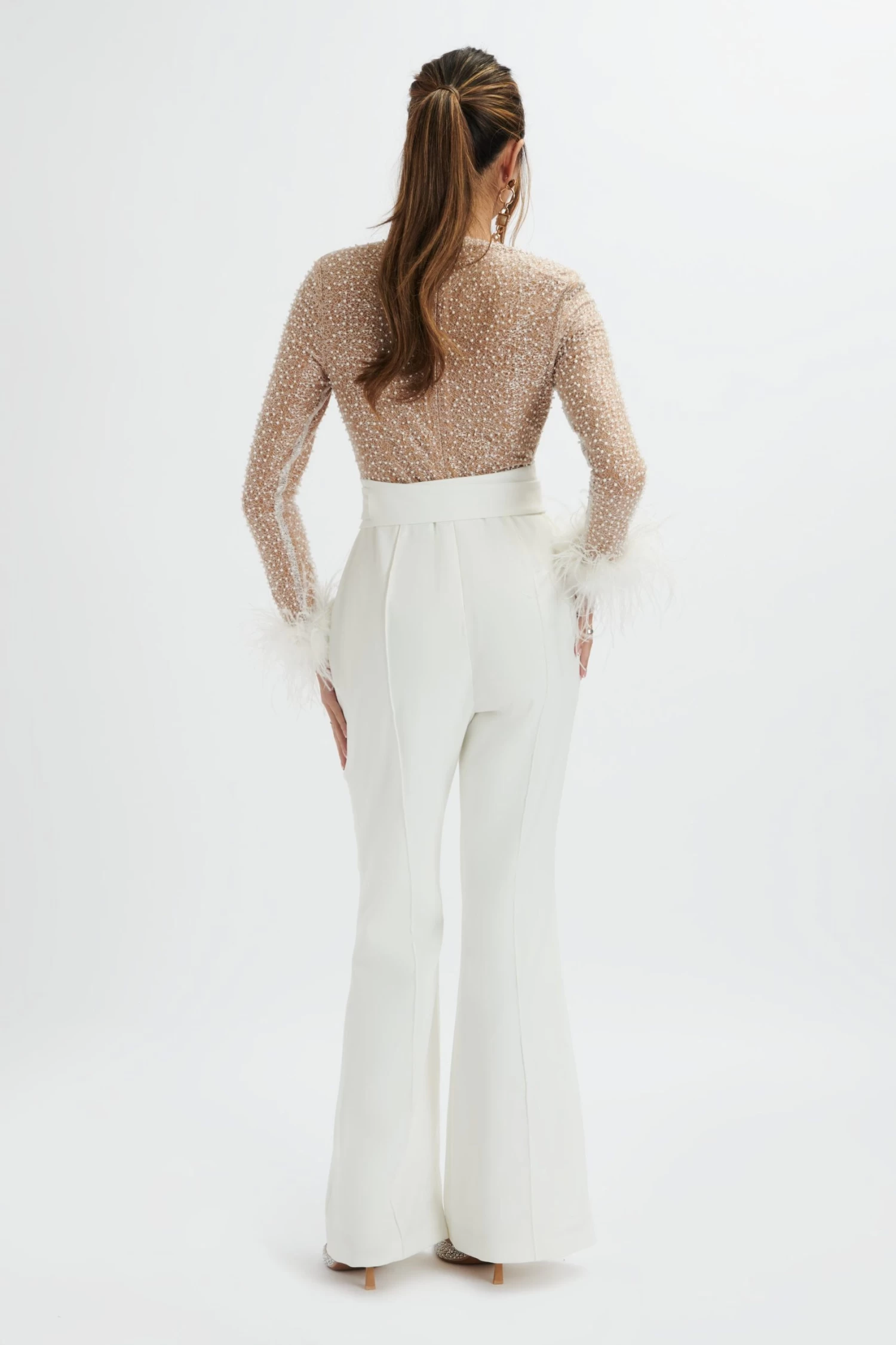 Elevate your style with our RAISA jumpsuit. The high quality crepe trouser in white is paired with a delicate pearl sequin and embroidered sheer upper body for a stunning contrast. The fit-and-flare tailored trouser and pin tuck detail create a flattering silhouette, while the ostrich feather cuff and self fabric obi belt add a touch of elegance. Complete with concealed shoulder pads and a centre-back zip fastening for a premium silhouette.