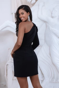 - Design Details: One shoulder mini blazer dress with an contrast embellished bustier. Flattering mini wrap skirt.
