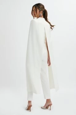 Discover the elegance and sophistication of our RAYNA jumpsuit. Crafted from high quality crepe, in a fresh white hue, this jumpsuit features a tailored cape design, flattering wrap over body, and close to body fit for a sleek and timeless look. With a centre front zip and hook and bar fastening at the waist, as well as shoulder pads for a structured silhouette, this jumpsuit offers both functionality and style. The longline cape with back split, tapered trouser leg shape, and classic lapel add the perfect touch of chic to this must-have piece.