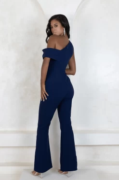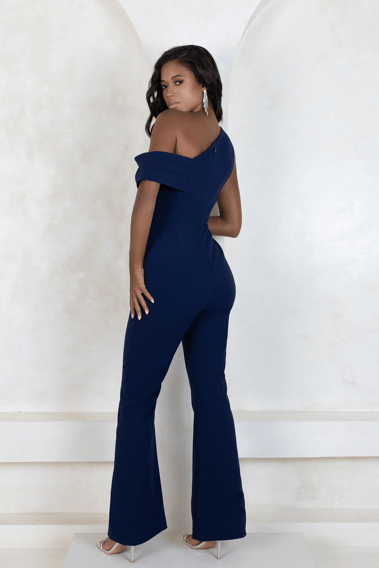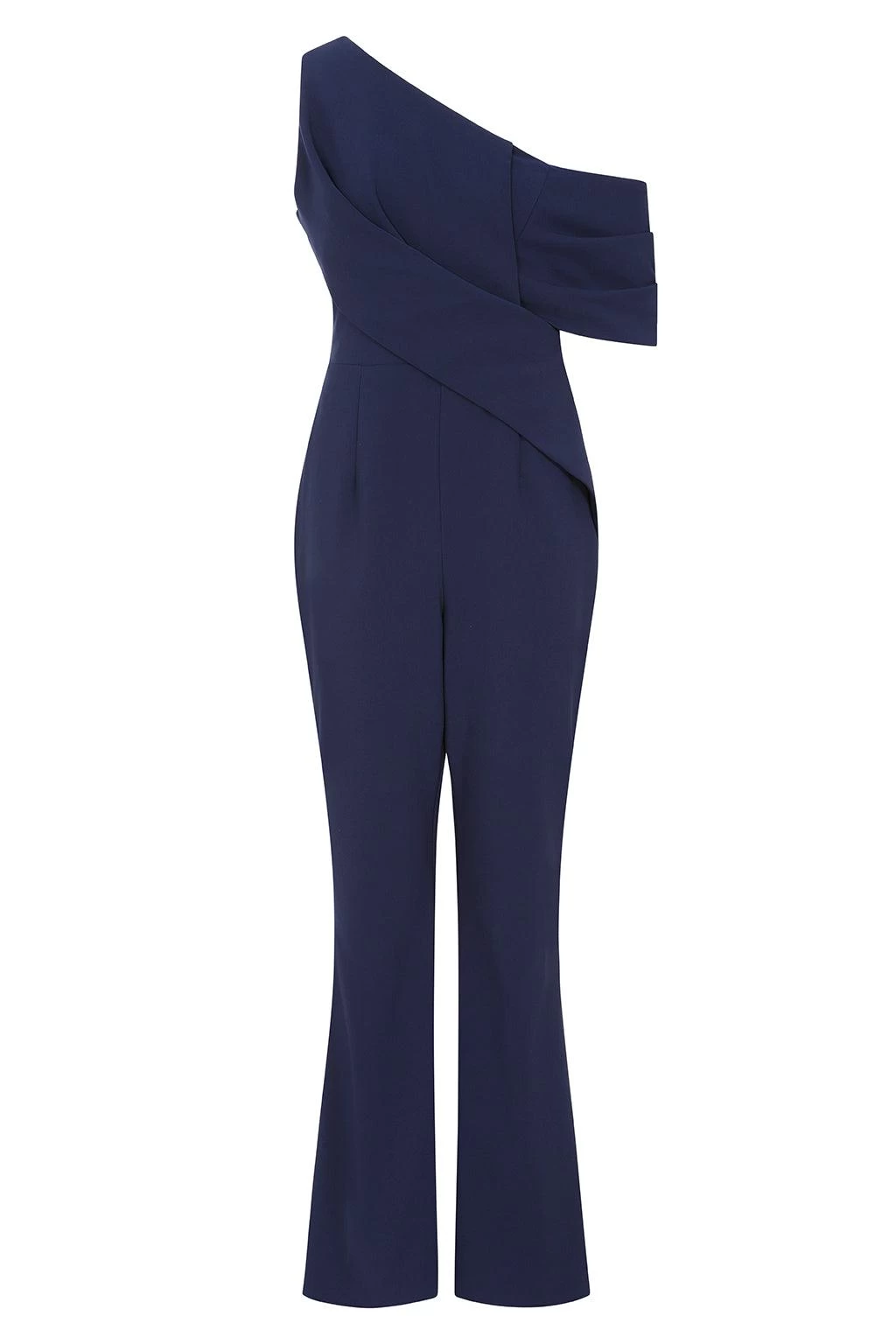 A lavish twist on a classic jumpsuit design, bespoke tailored flares elongate the leg whilst pleats fall neatly over one shoulder to create a sophisticated silhouette. Finish with refined silver jewellery for an opulent look.