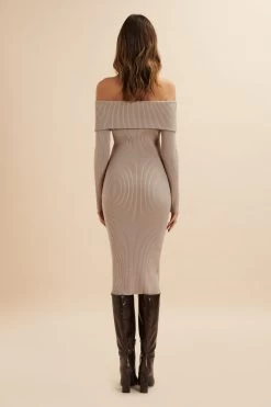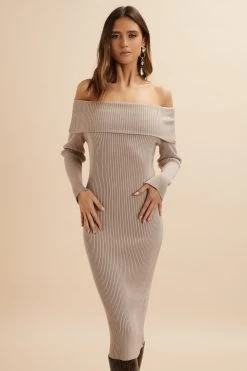 Introducing the SUNDAY Wool Blend Midi Dress. Featuring a ribbed knitted construction and finest yarn, this dress offers a flattering fit with its fold Bardot neckline and off-shoulder design. Perfect for any occasion, its elegant and versatile design is sure to make a statement.