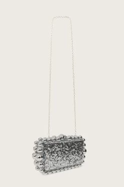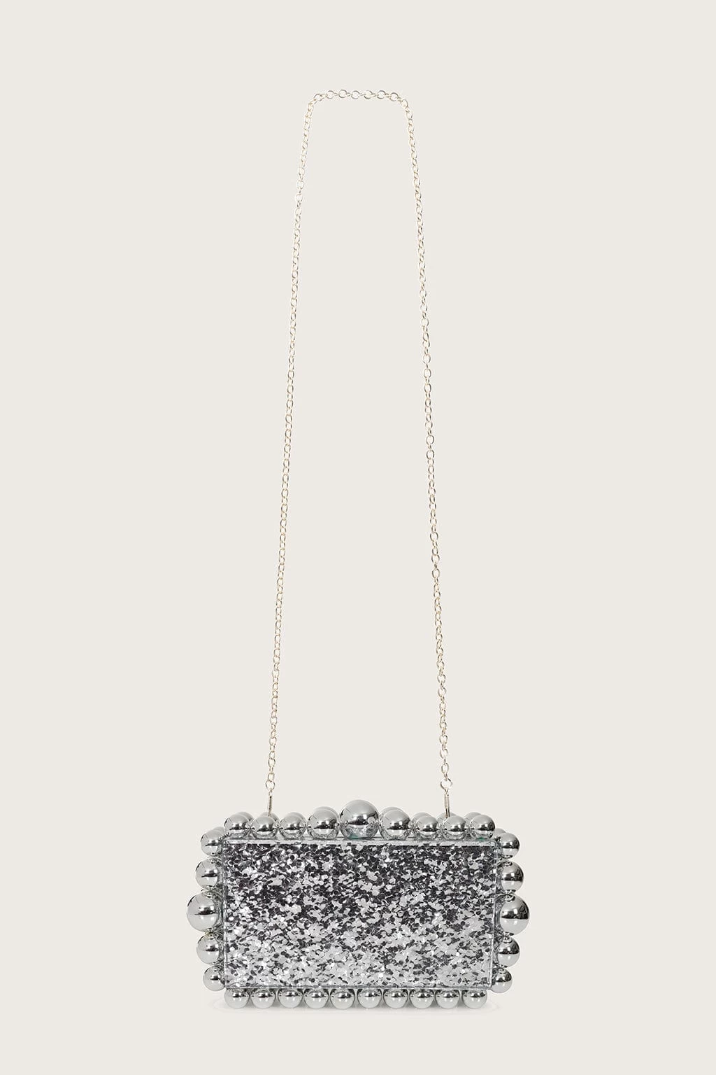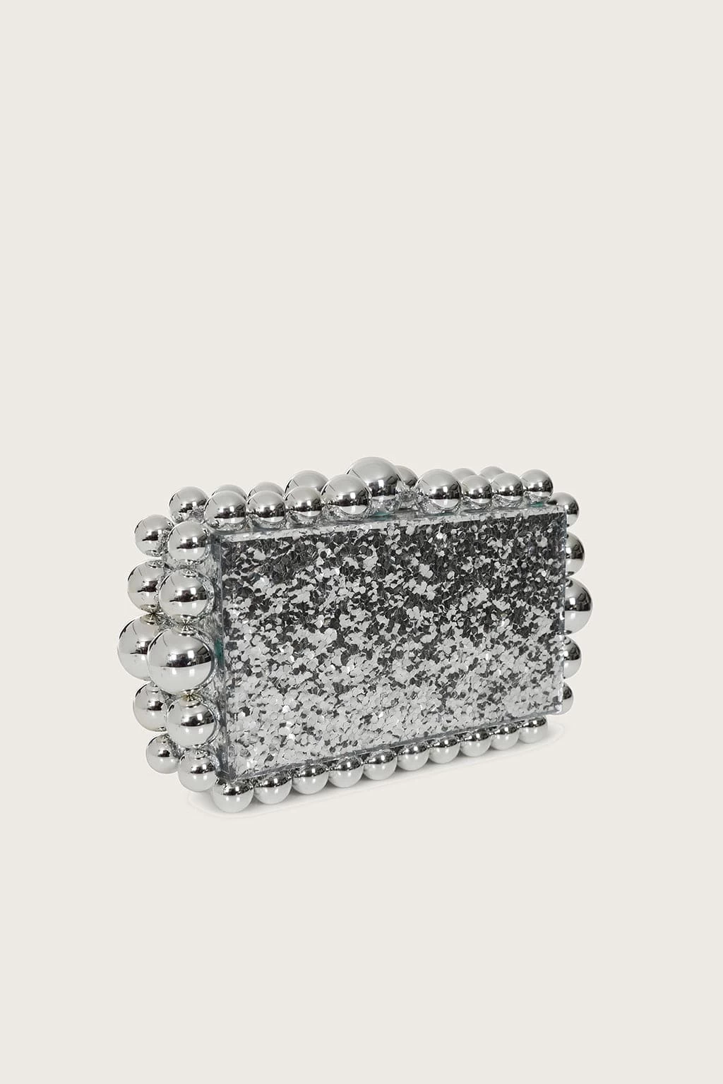 Introducing the TIA Marbled Faux Pearl Box Clutch Bag in Silver. This elegant clutch features a marbled faux pearl box design with a stunning beaded trim. Perfect for any occasion, its dazzling and stylish design adds a touch of glamour to any outfit. Elevate your accessory game with the TIA Clutch Bag.