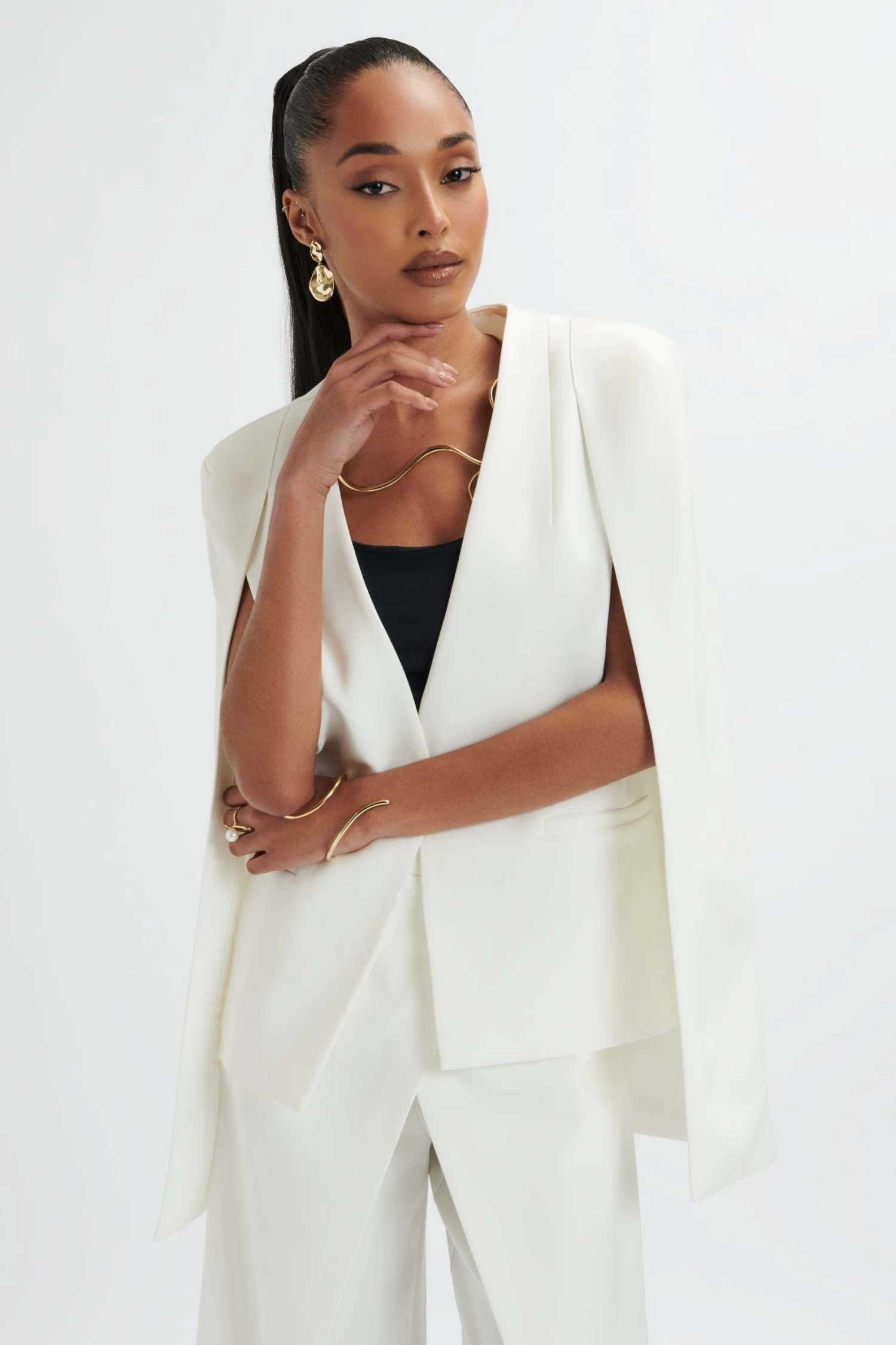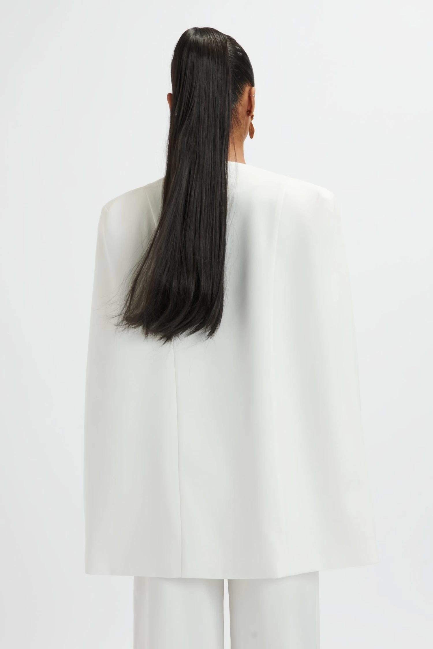 Expertly crafted from premium white crepe, this cape blazer jacket boasts timeless tailoring and a contemporary collarless neckline. With no fastenings, it is designed to be worn open for a modern and sophisticated look. The shoulder pads provide a structured silhouette, while the princess seams and bust darts ensure a flattering fit. Fully lined and faced with a bagged out finish, this blazer exudes quality and luxury.
